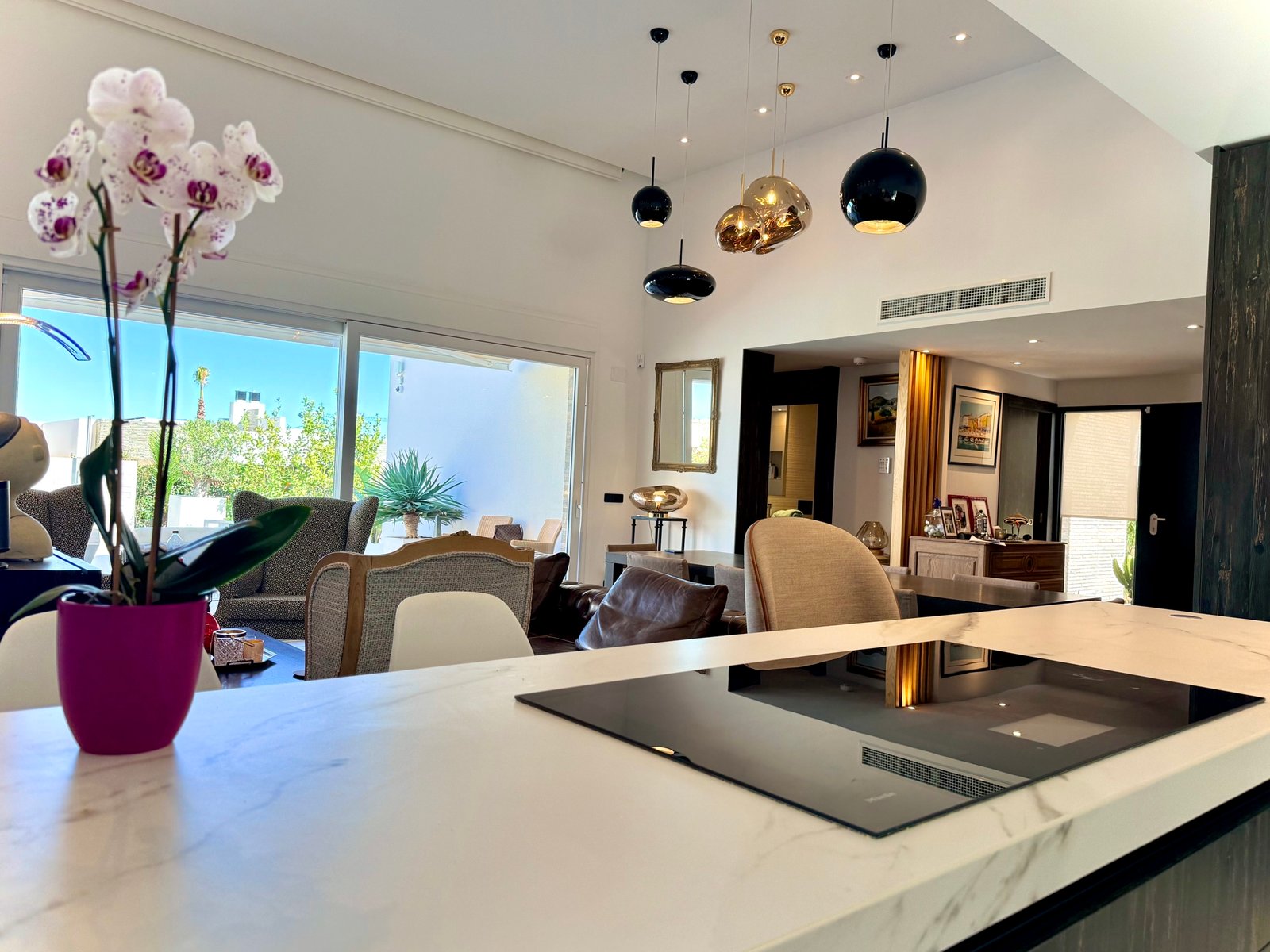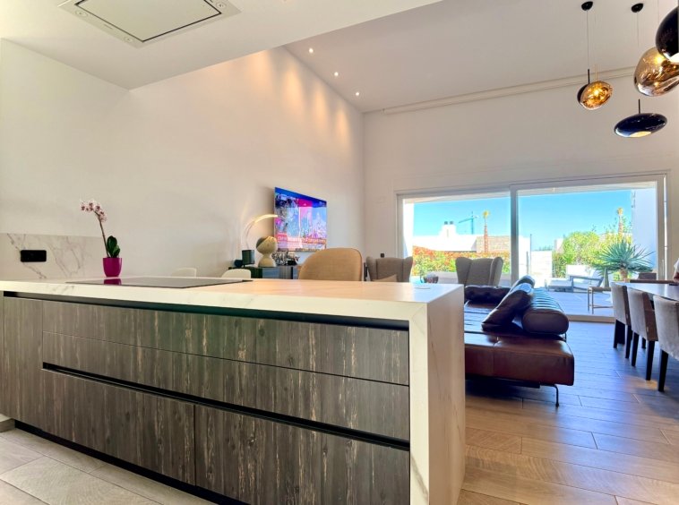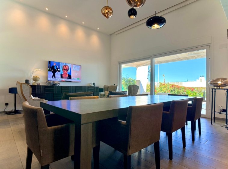 The living space connects seamlessly with the outdoor terraces and private swimming pool, creating the perfect indoor–outdoor flow typical of modern Mediterranean villas on the Costa Blanca.