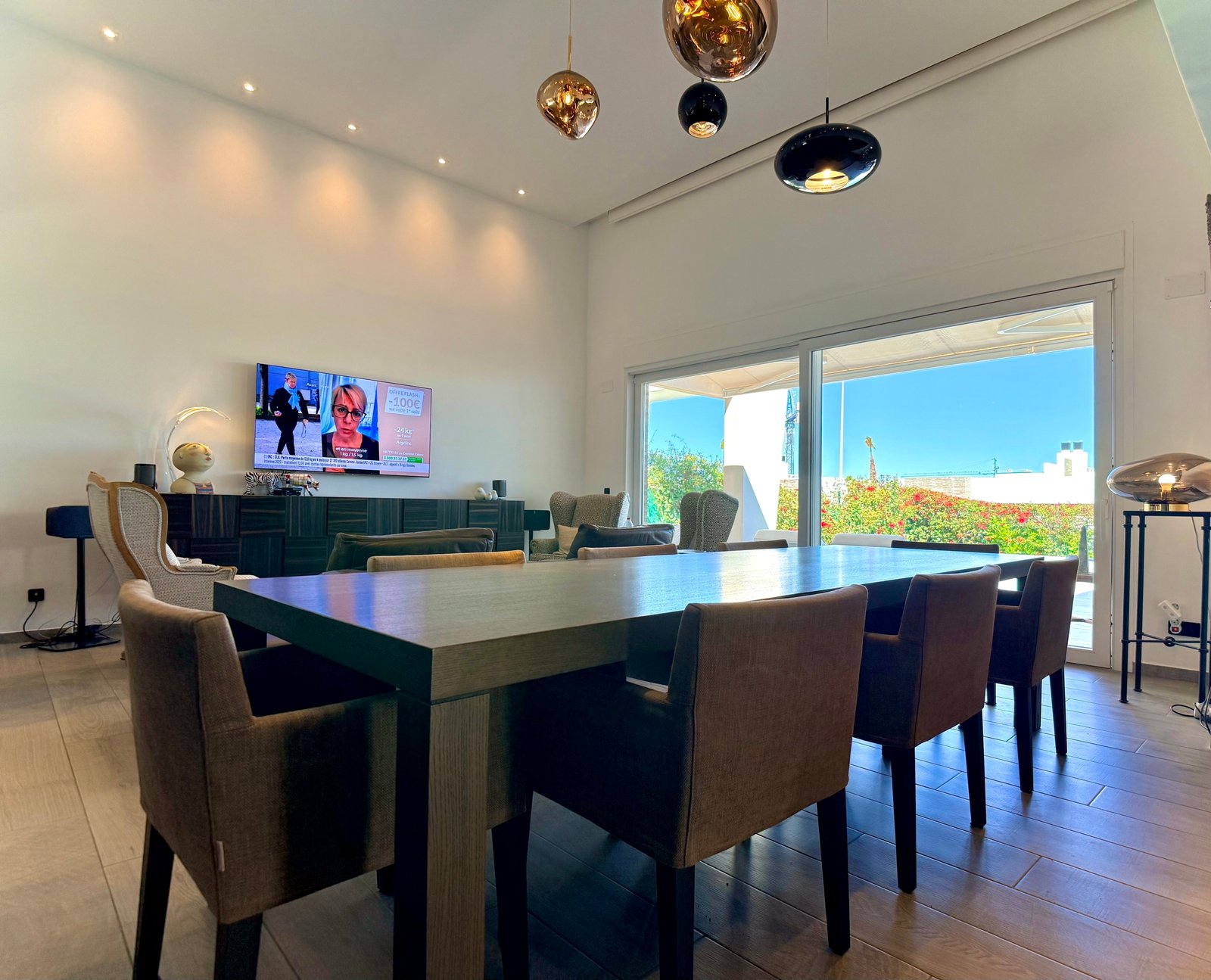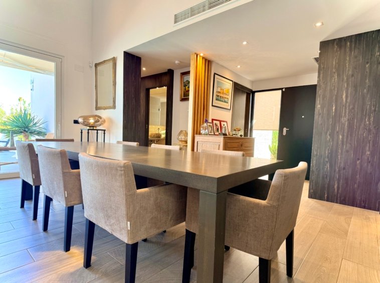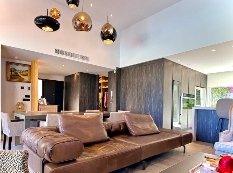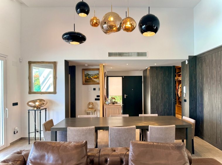 Upon entering the villa, you are welcomed by a bright open-plan living and dining area with large windows at both the front and rear of the property, allowing natural light to fill the interior spaces throughout the day.